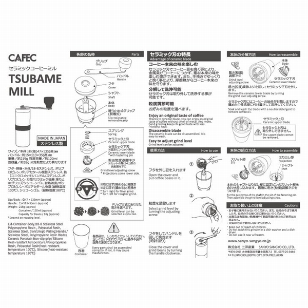 ステンレス製、セラミック刃の手挽きコーヒーミルです。 セラミック刃の為、金属臭がコーヒーにつかず、素材本来の味が楽しめます。 また、手挽きでゆっくり挽く事により、摩擦熱からコーヒー本来の味を守ります。